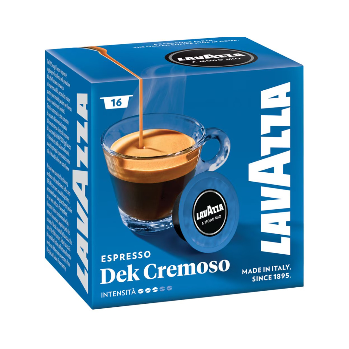 Lavazza Капсули A Modo Mio Декафеинато Кремозо 16 бр предлагат плътен и балансиран вкус без съдържание на кофеин. Кафето се отличава с мек аромат, кадифена текстура и деликатни нотки на шоколад. Подходящ избор за любителите на еспресо, които предпочитат безкофеинов вариант, без компромис с вкуса. Съвместими със система Lavazza A Modo Mio.