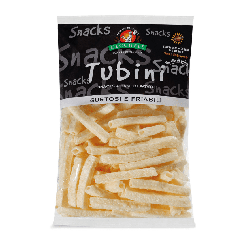 Gecchele снакс тръбички са хрупкаво и леко хапване с приятен картофен вкус. Подходящи са за похапване по всяко време или за споделяне с приятели. Отличават се с нежна текстура и апетитен аромат.